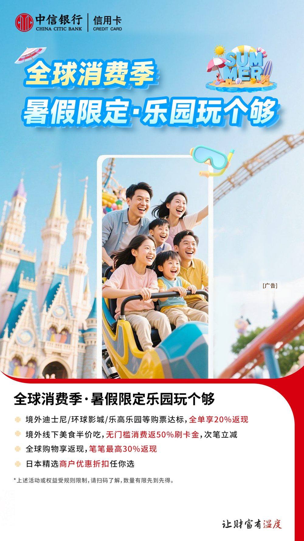 面向暑期亲子出行的中枢东说念主群,中信银行针对“全球主题乐土”打造了丰富的礼遇权利,助力在全球领域内解锁畅游体验。其中,中信银行万事达信用卡握卡东说念主在全球指定迪士尼乐土、环球影城、乐高乐土线上或线下来去满100好意思元,即可享受全单20%返现优惠;指定中信银行Visa信用卡握卡东说念主在境外指定博物馆、国度公园、主题乐土等线下门票来去时,有契机得回笔笔100%返现;中信银行JCB信用卡握卡东说念主在韩国爱宝乐土线下购买门票可享7折优惠。
